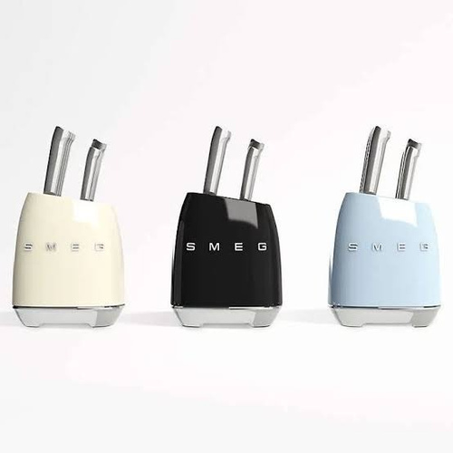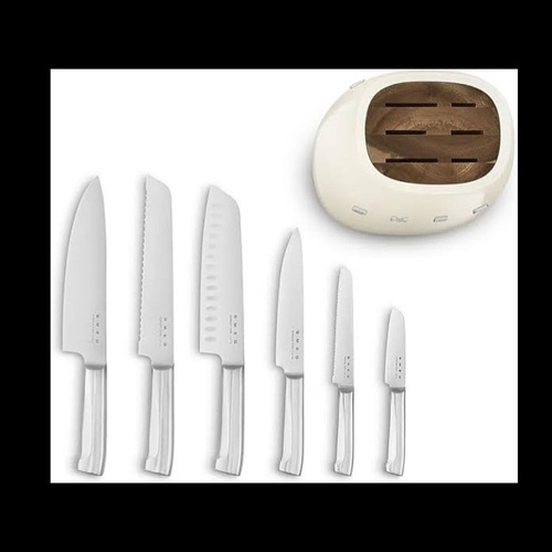 با این ست بلوک چاقو 7 تکه ، استایل کلاسیک SMEG و ظاهری قدیمی دهه 1950 را به میز آشپزخانه خود بیاورید! بلوک چاقوی چوب اقاقیا دارای بدنه بیرونی فولاد کربنی با پوشش پولیش است که به راحتی تمیز میشود و به رنگ کرم براق پوشیده شده است برای هماهنگی با سایر لوازم SMEG رنگ است.پایههای ضد لغزش مانع از لغزش بلوک در هنگام برداشتن چاقو میشوند. چاقوهای این مجموعه دارای تیغه های با کیفیت استیل ضد زنگ آلمانی و دسته های فولادی ضد زنگ صیقلی و بسیار بادوام هستند و برای کارهای روزمره برش انواع مواد غذایی آماده هستند. این مجموعه شامل چاقوی سبزیجات، چاقوی همه کاره، چاقوی گوشت، چاقوی سانتوکو، چاقوی نان و چاقوی آشپز می باشد.
